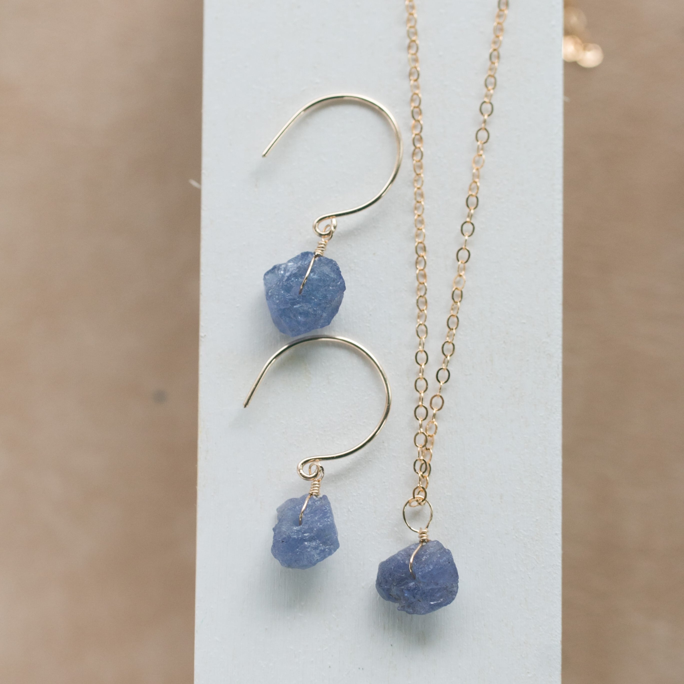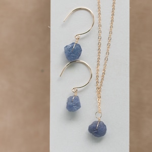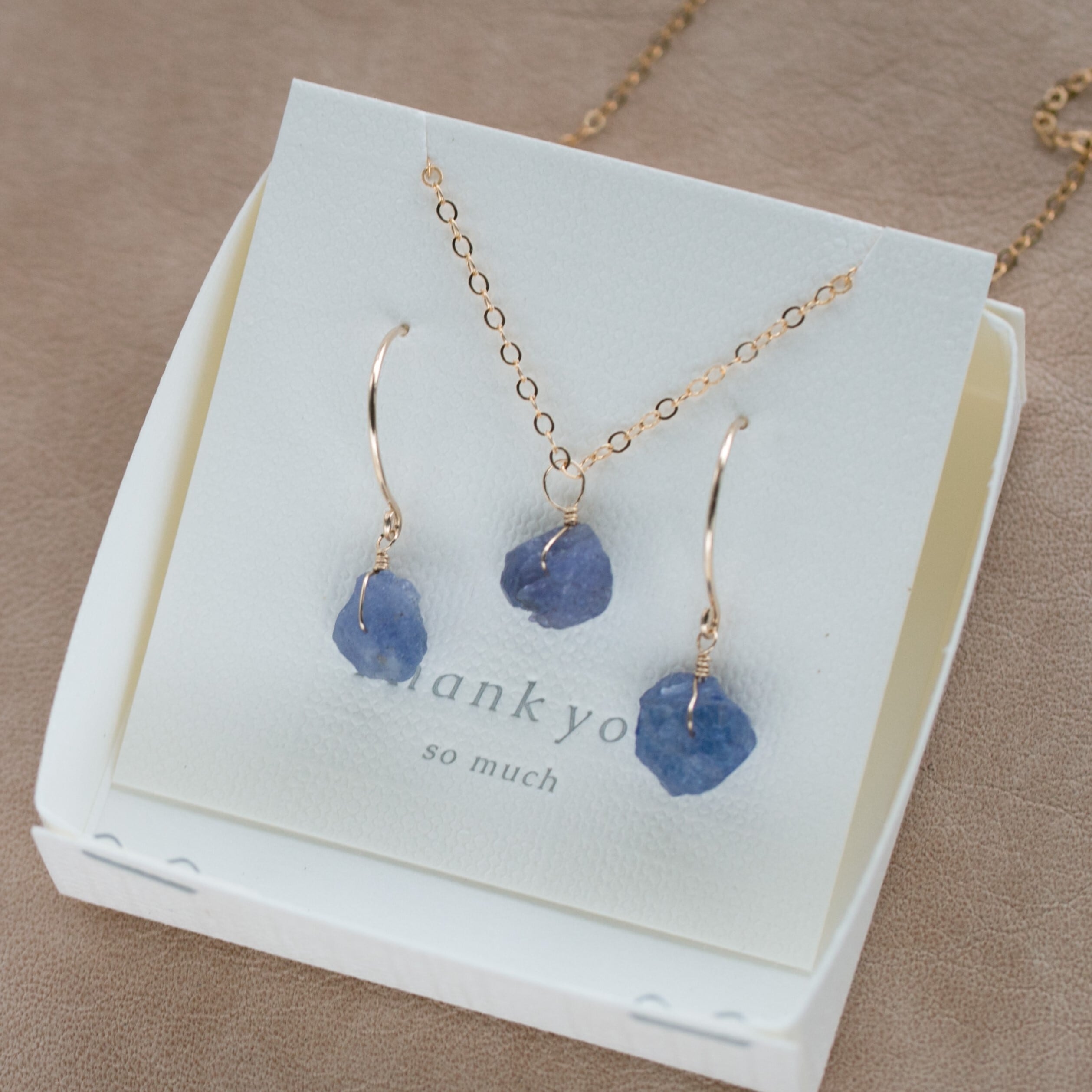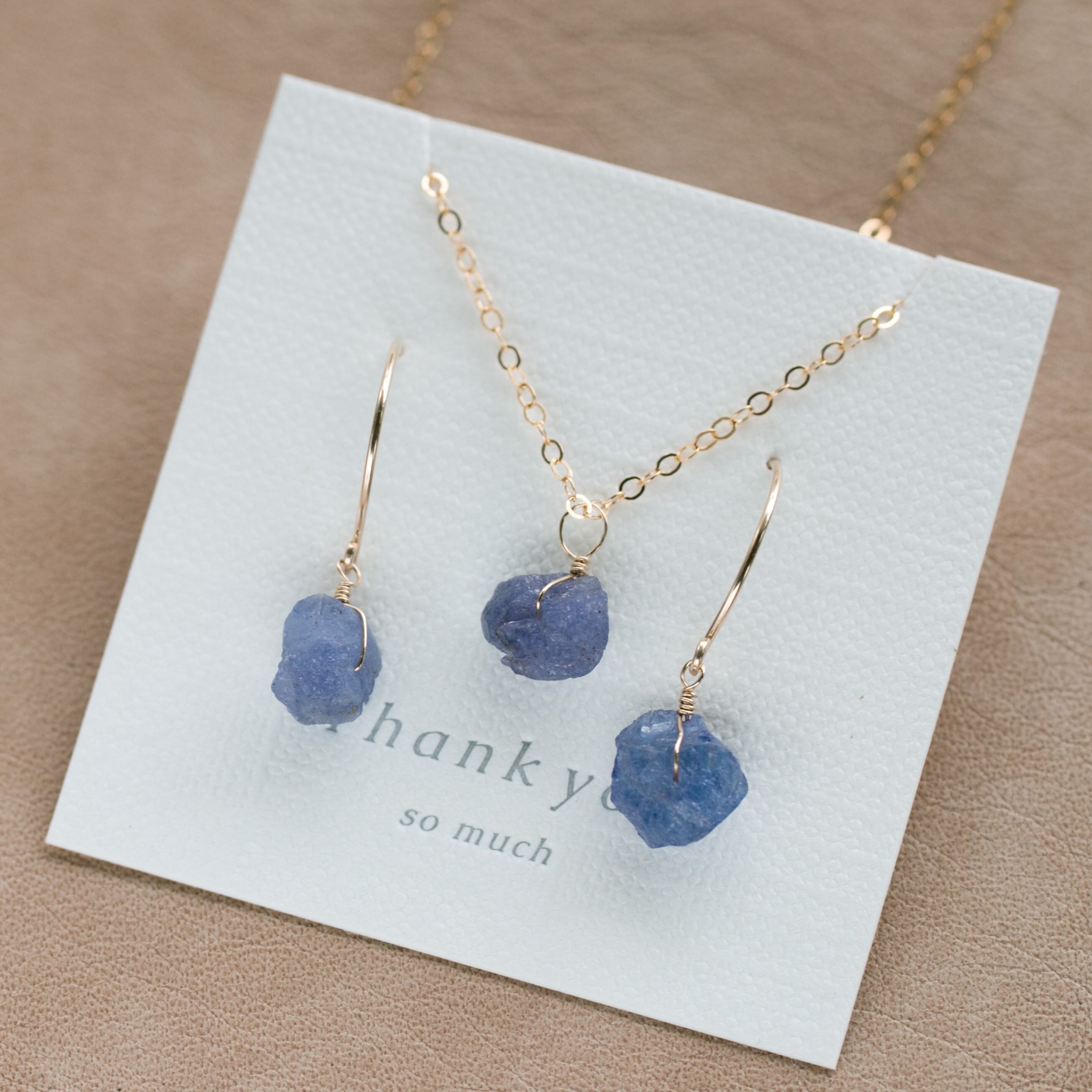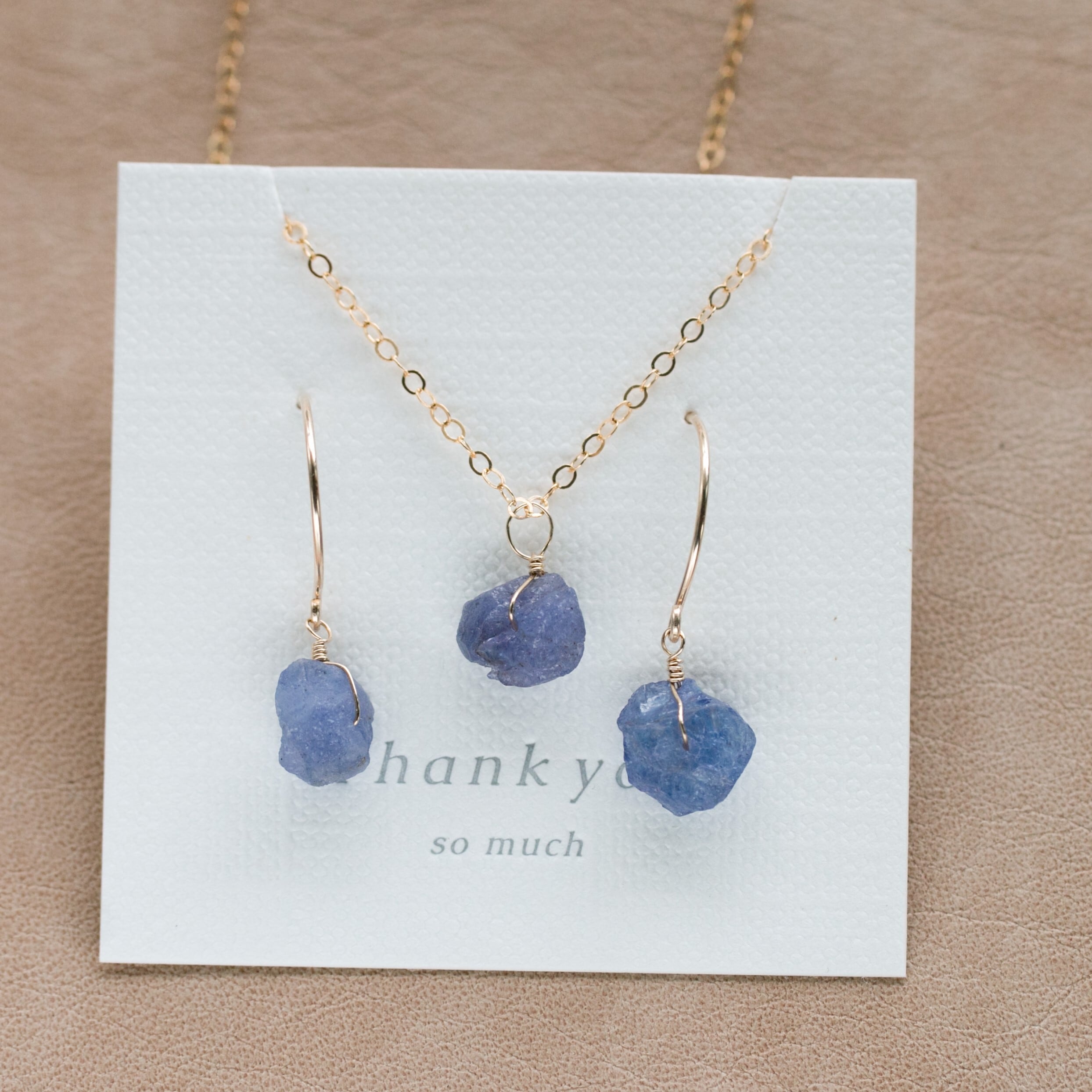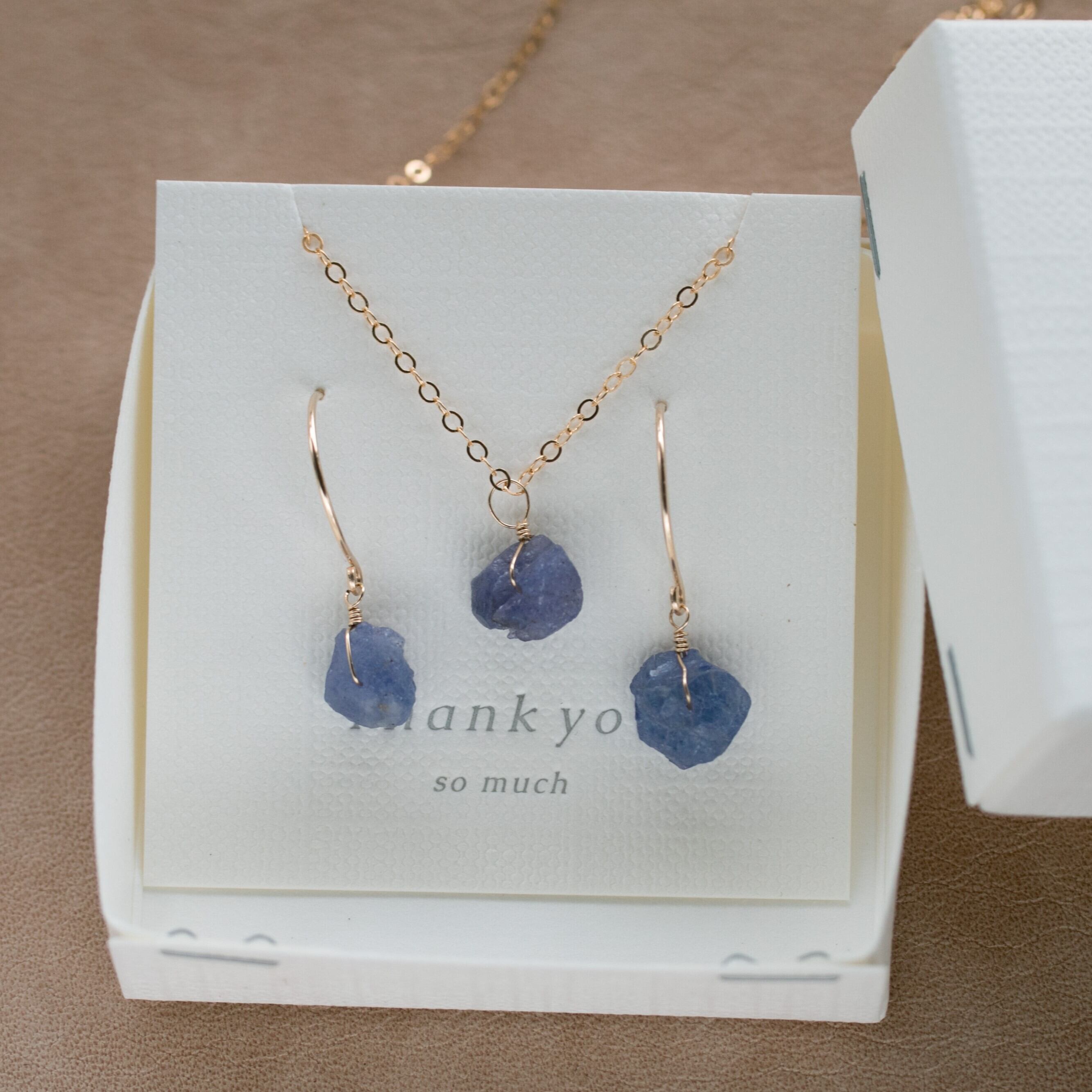 ギフトラッピング無料☆レア☆タンザナイト原石ラフカットAAA★一粒ペンダントとピアスのセット☆14kgfフックピアス・イヤリングへの変更無料♪