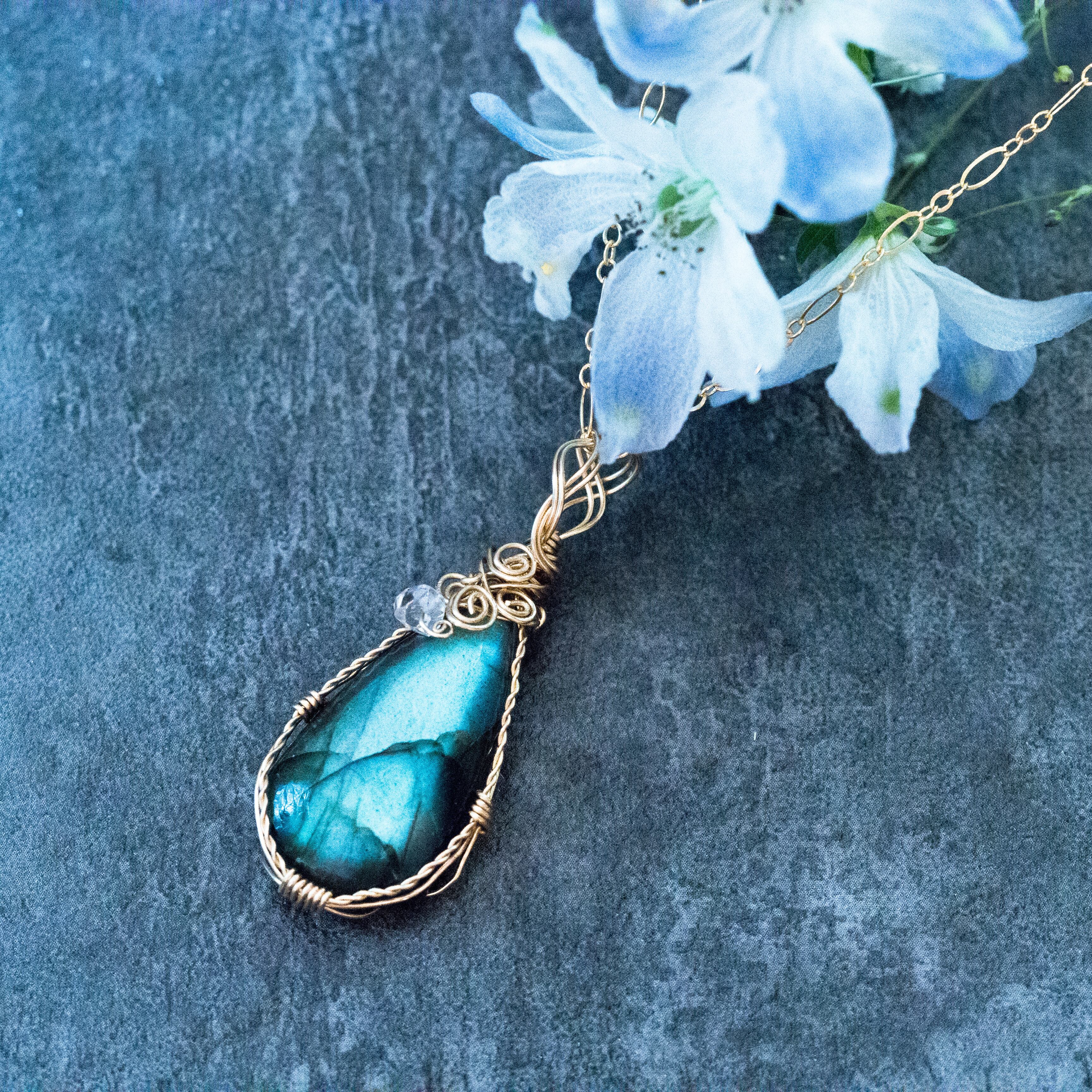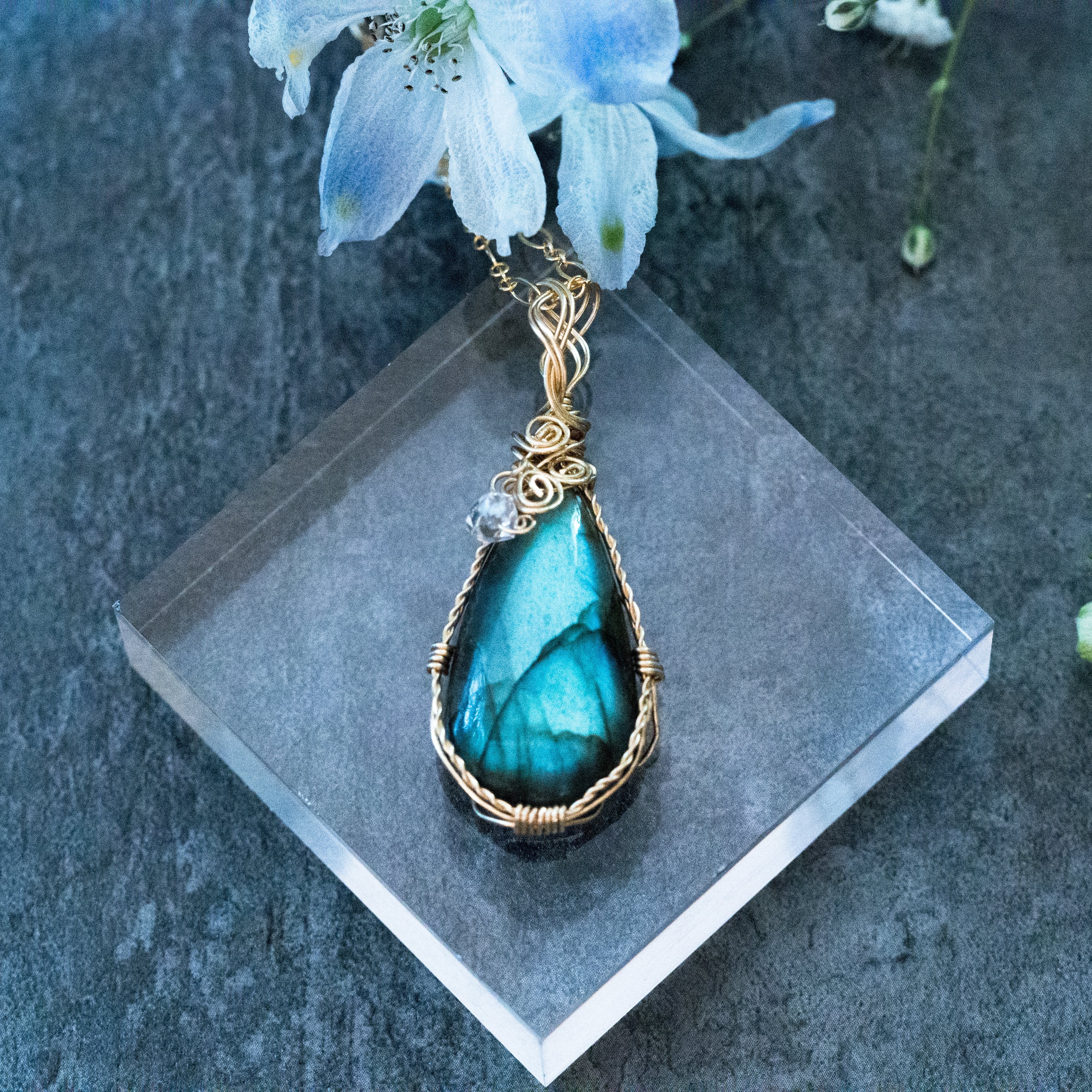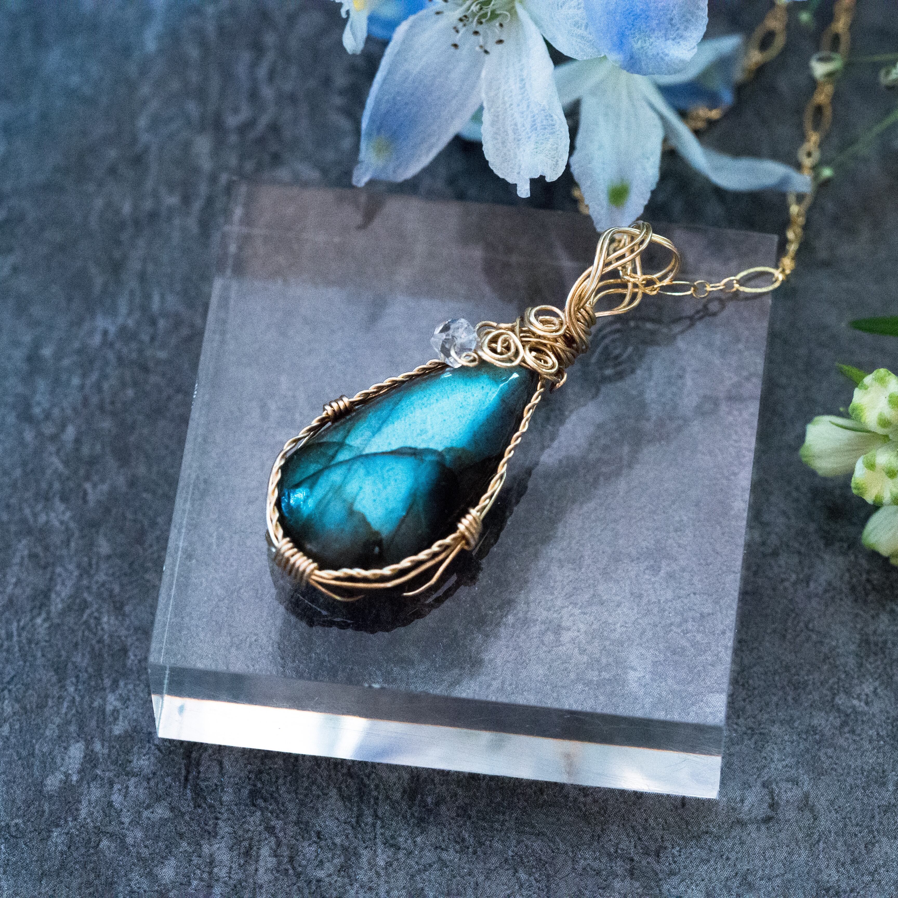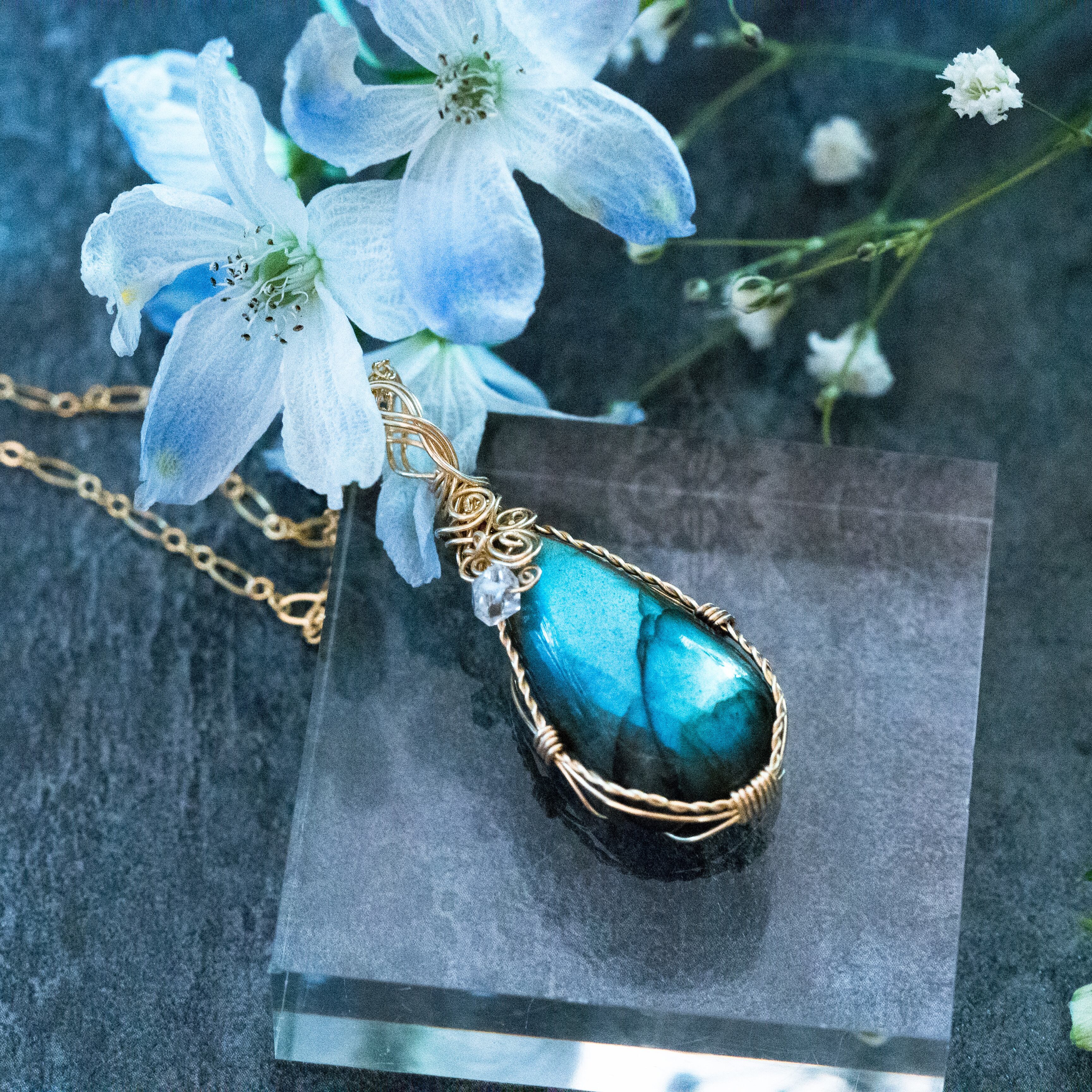 美しいラブラドライトをエレガントなワイヤーワークで仕立て、一粒のハーキマーダイヤモンドを添えました