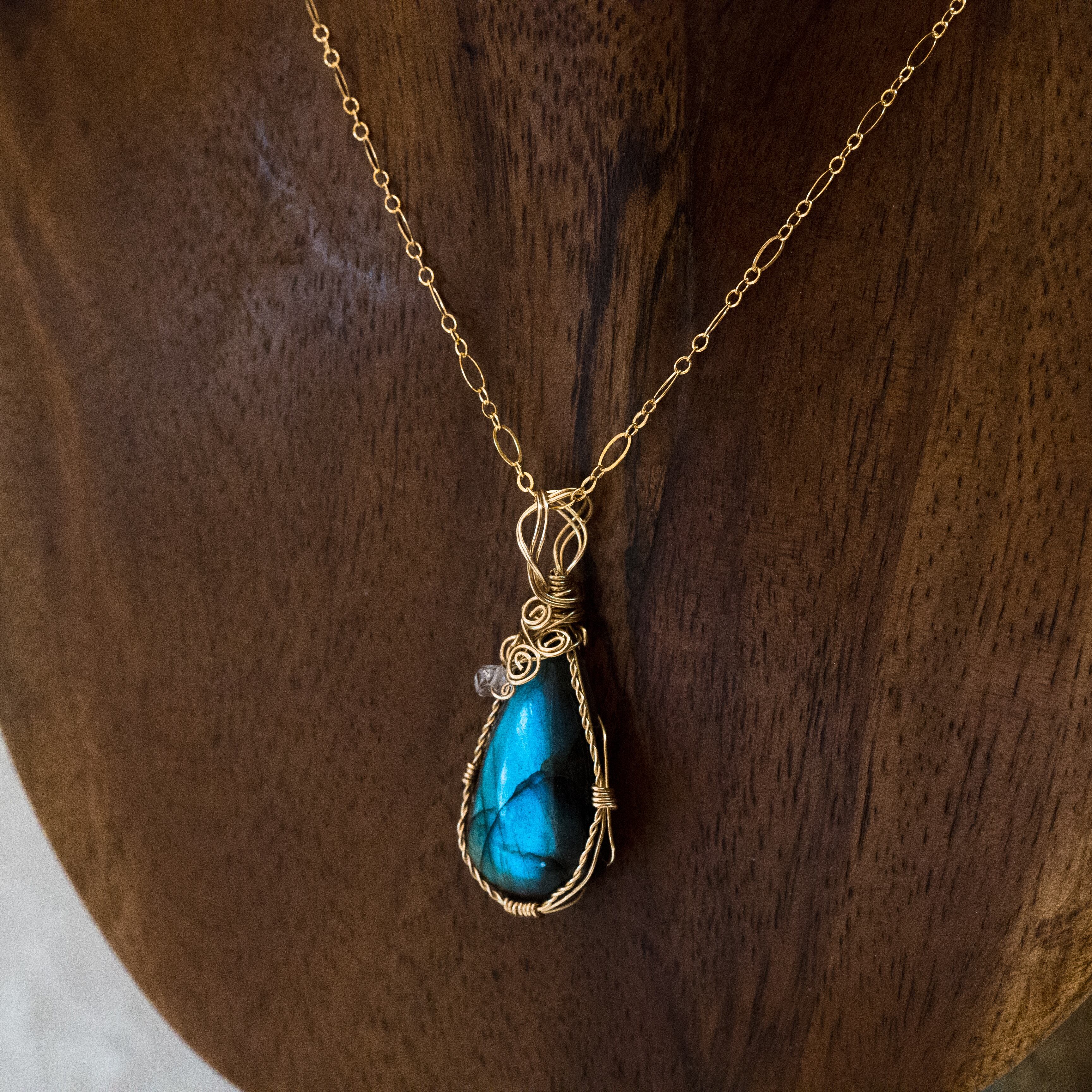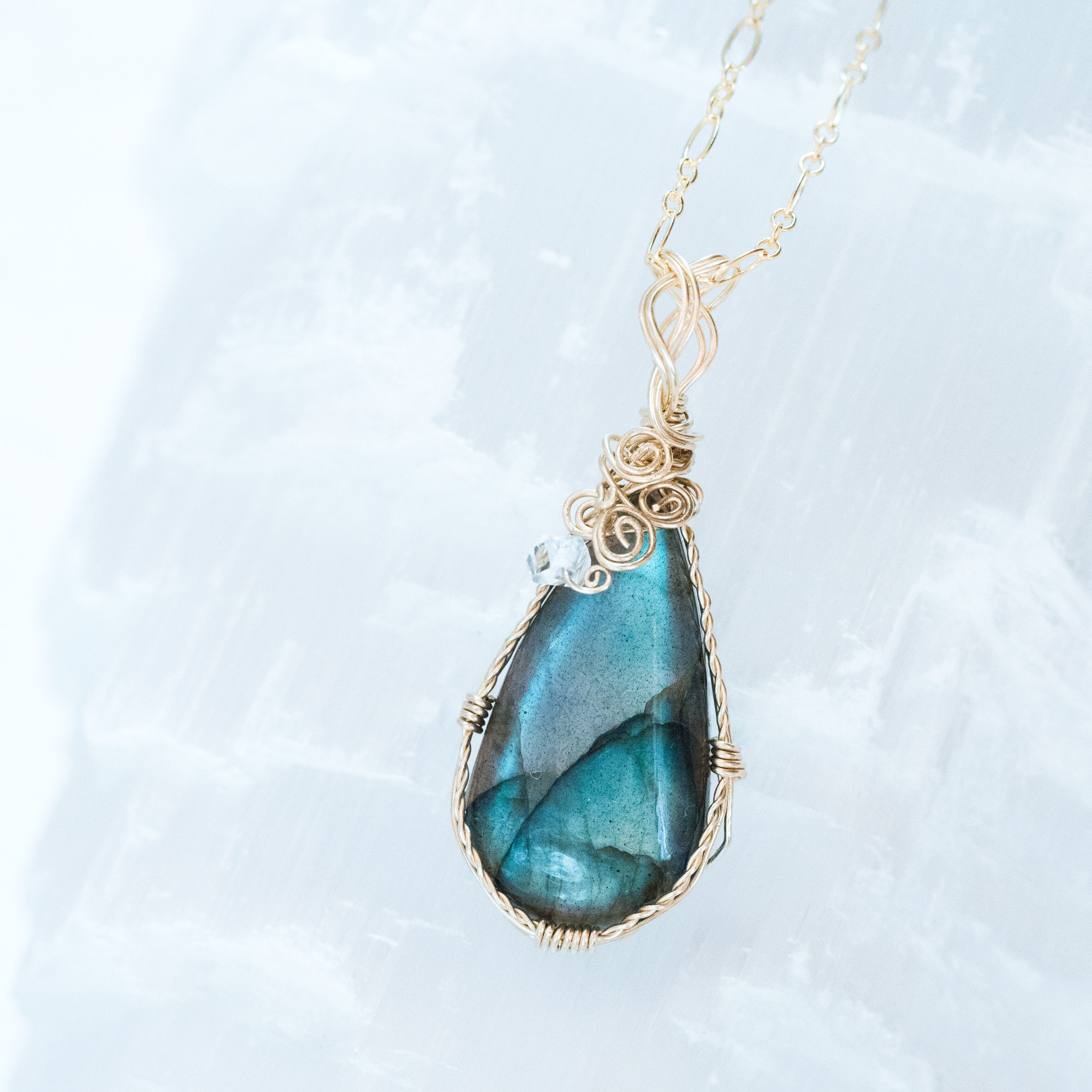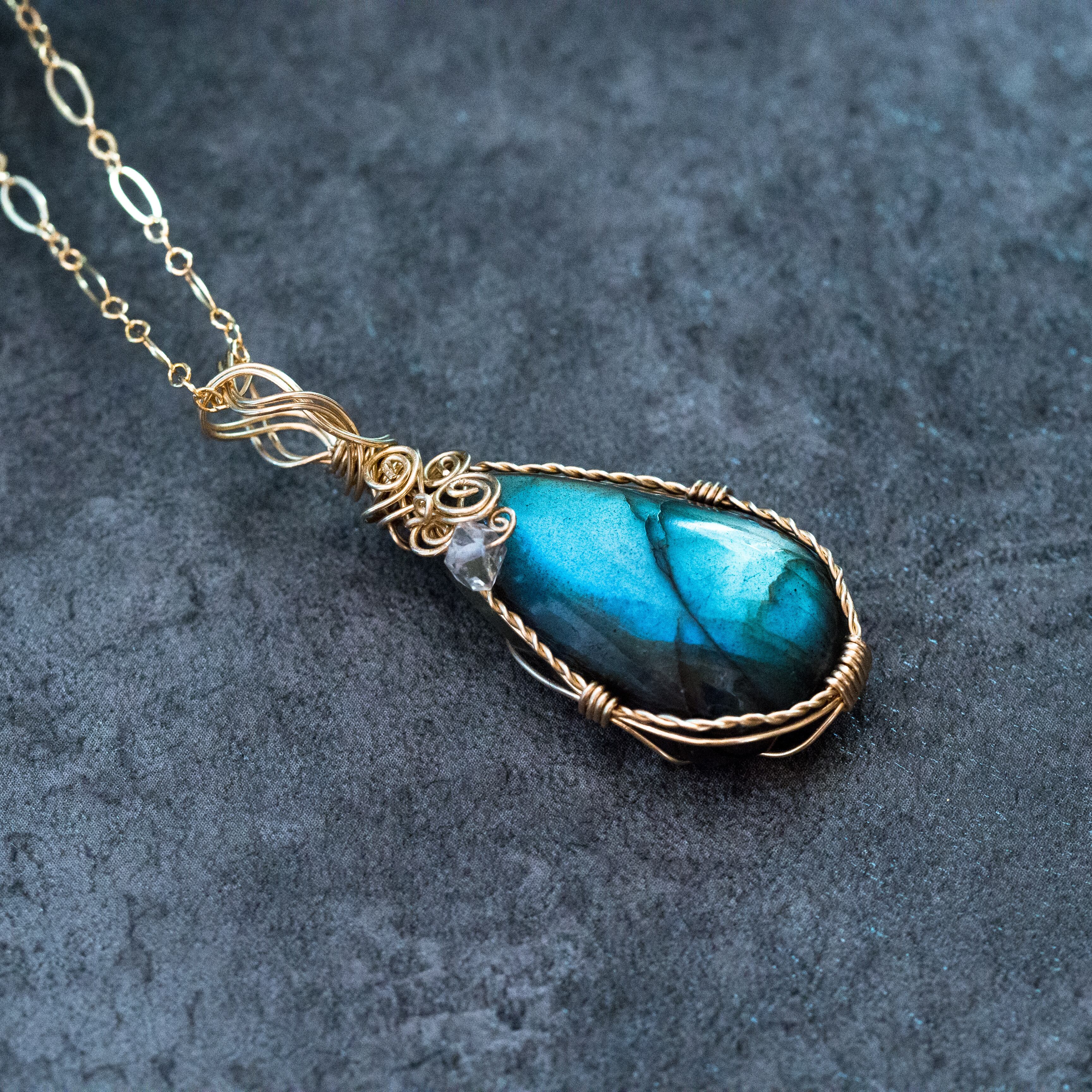 美しいラブラドライトをエレガントなワイヤーワークで仕立て、一粒のハーキマーダイヤモンドを添えました