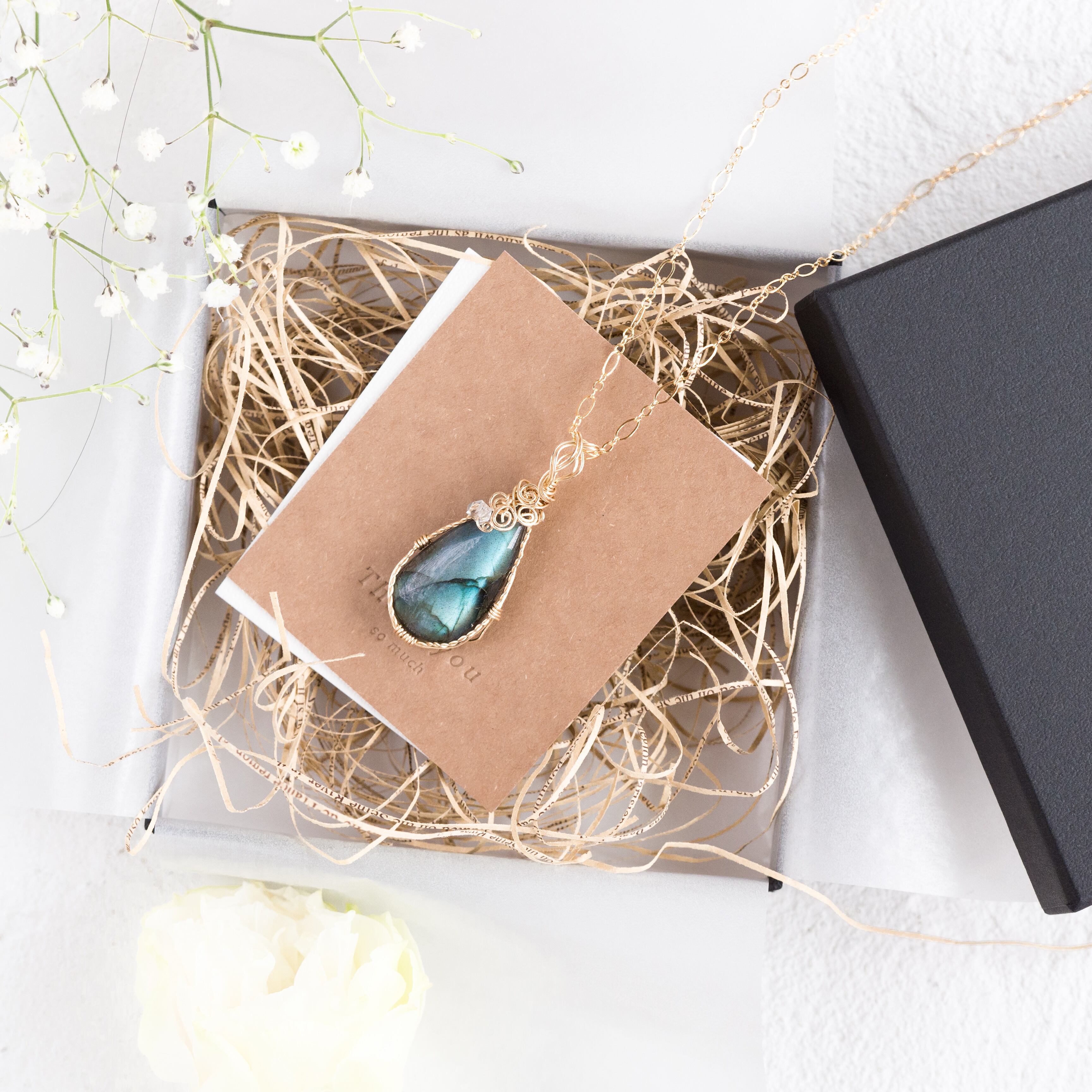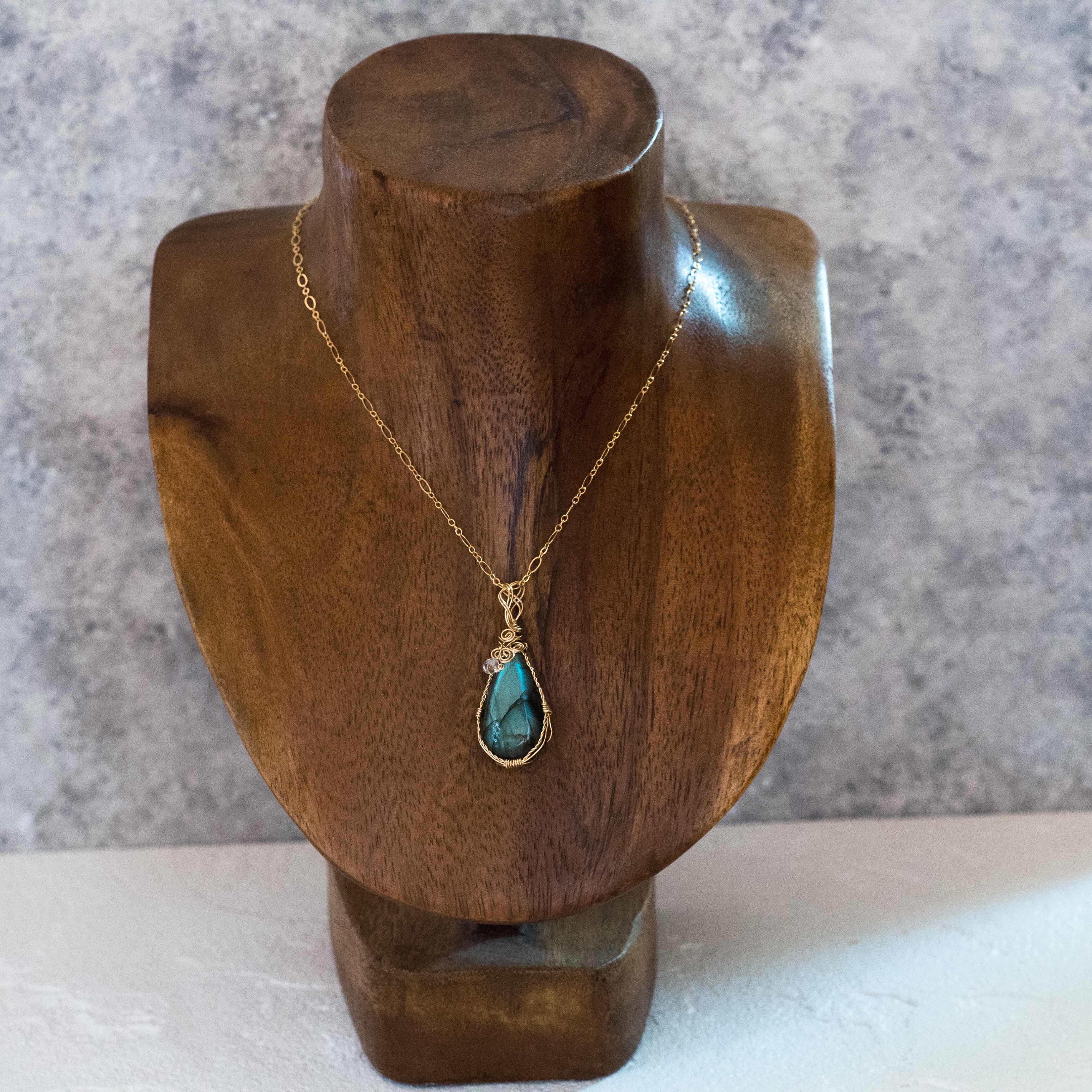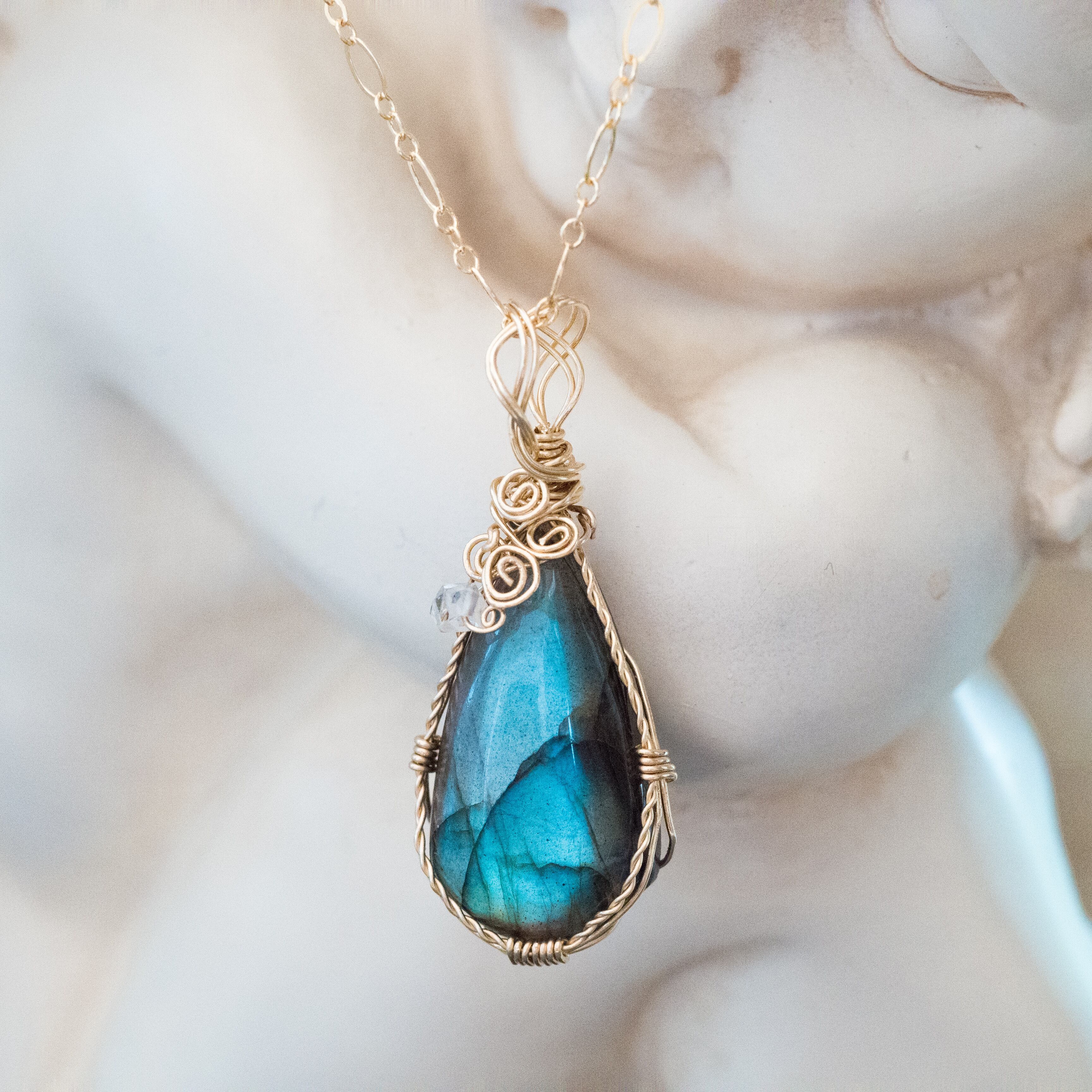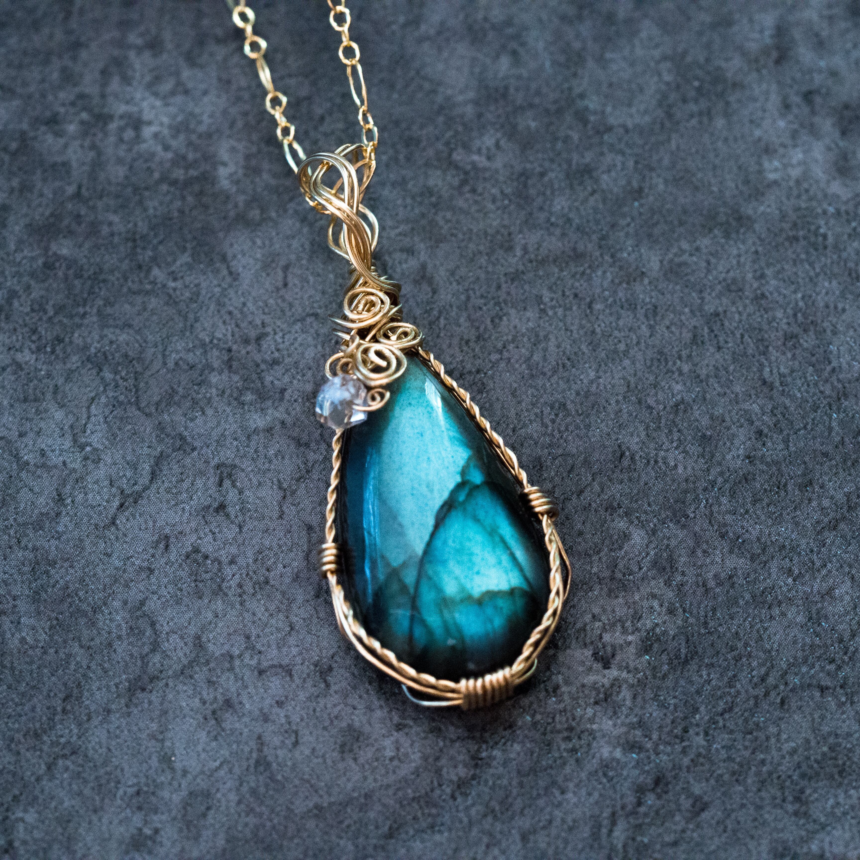美しいラブラドライトをエレガントなワイヤーワークで仕立て、一粒のハーキマーダイヤモンドを添えました